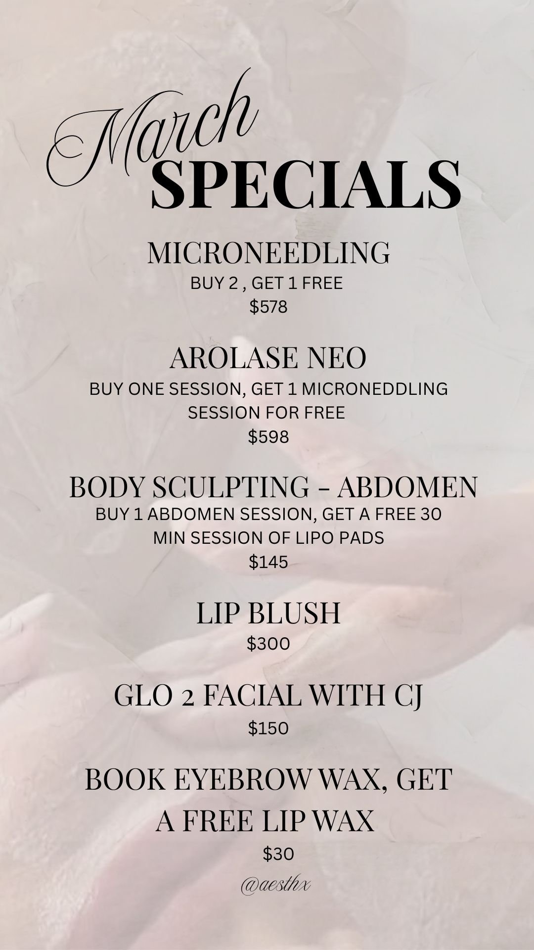 WHAT’S NEW AT AESTHX? HELLO MARCH HELLO MARCH HELLO MARCH MONTHLY SPECIALS BOOK MARCH SPECIAL DISCOVER THE ULTIMATE POWER DUO FOR SMOOTH, RADIENT, YOUTHFULL SKIN MICRONEEDLING SKIN RESURFACING & REJUVINATION ACNE BOOTCAMP View fullsize E-GIFT CARDSNOW AVAILABLE BUY AN E-GIFT CARD NOW!